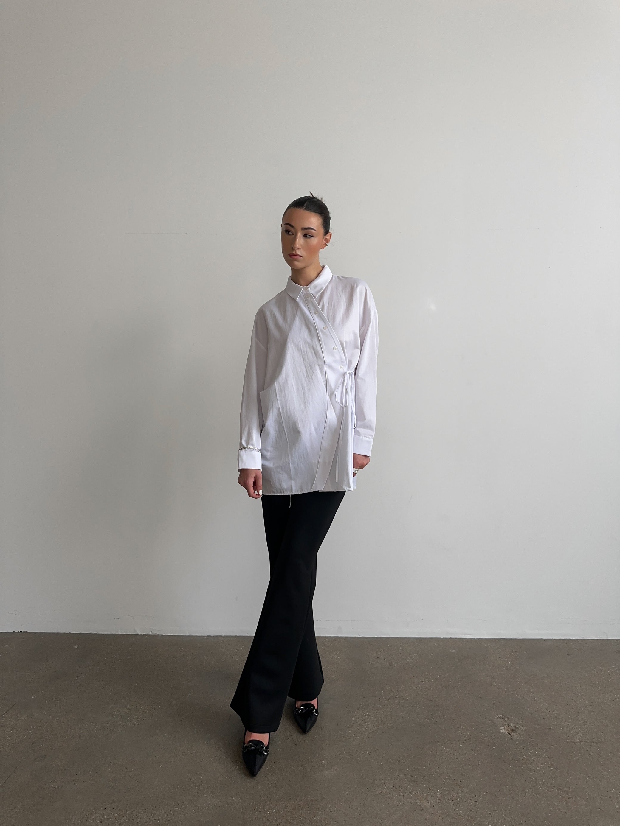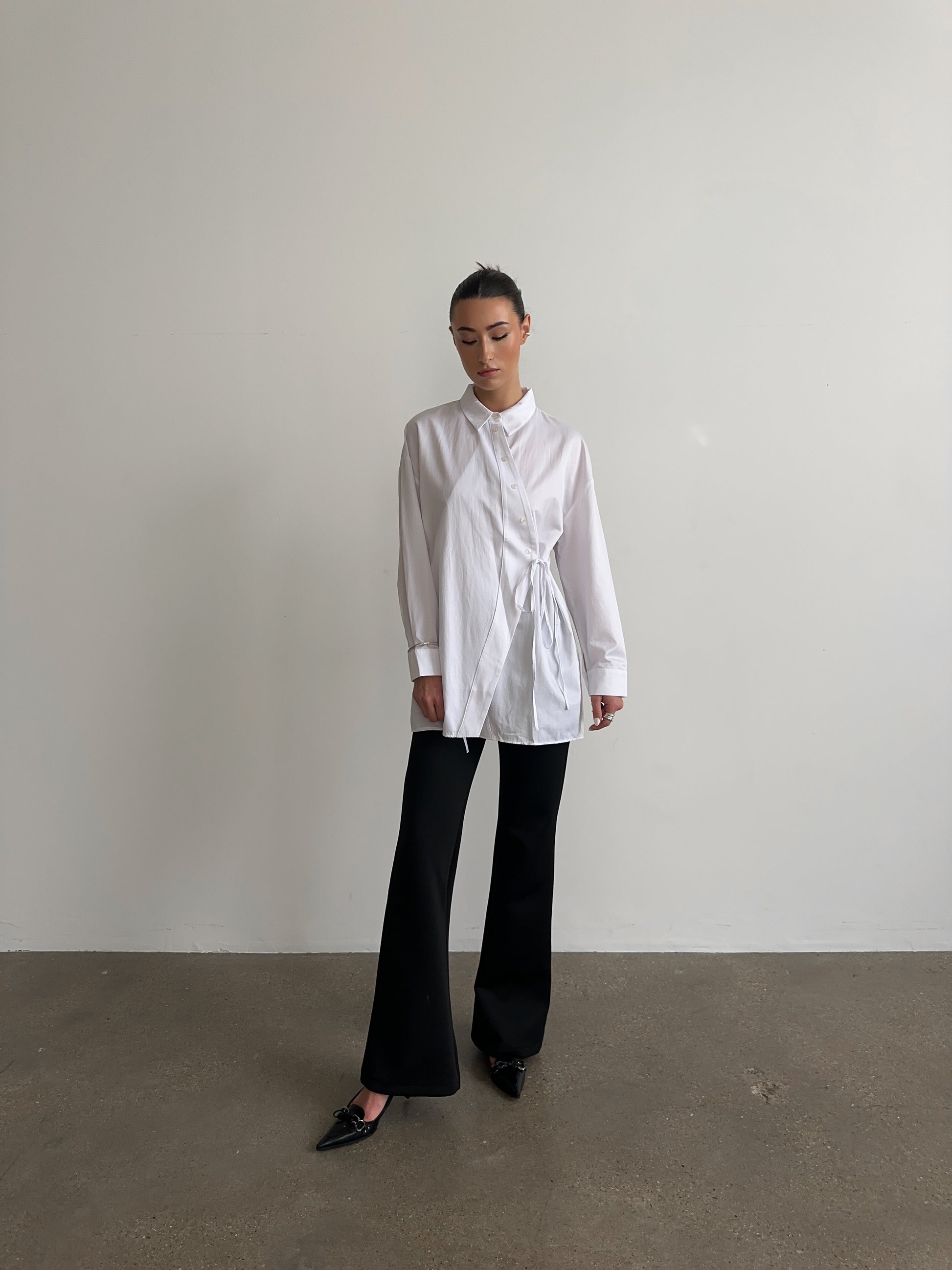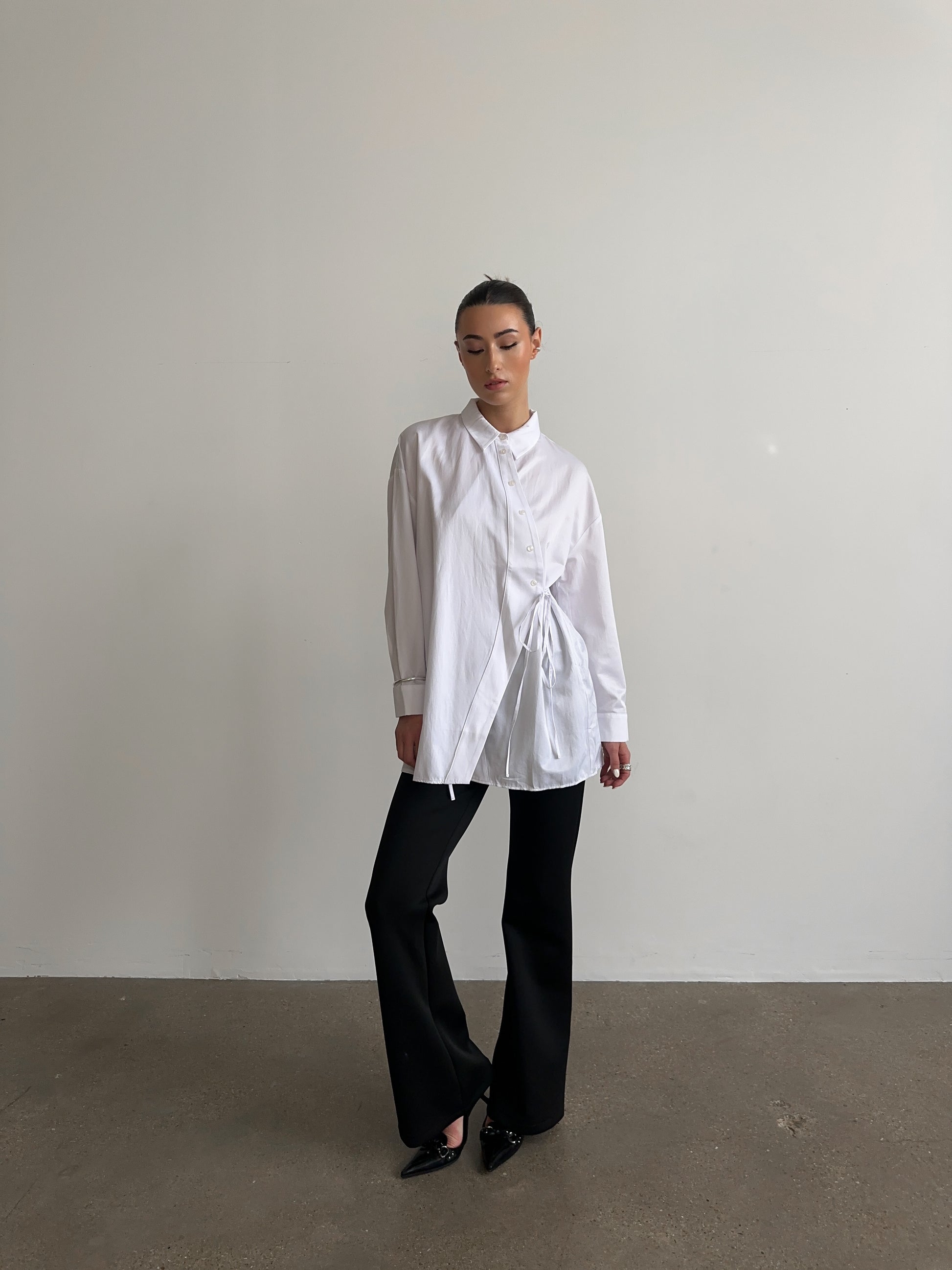 The Essie Shirt is a relaxed cotton shirt featuring an asymmetrical cut and long cuffed sleeves for a unique take on a classic button down. With a tie on the side to offer a slightly cinched waist, this lightweight shirt offers a modern and sophisticated look for any occasion. Pair with our Noire Flare Pants.