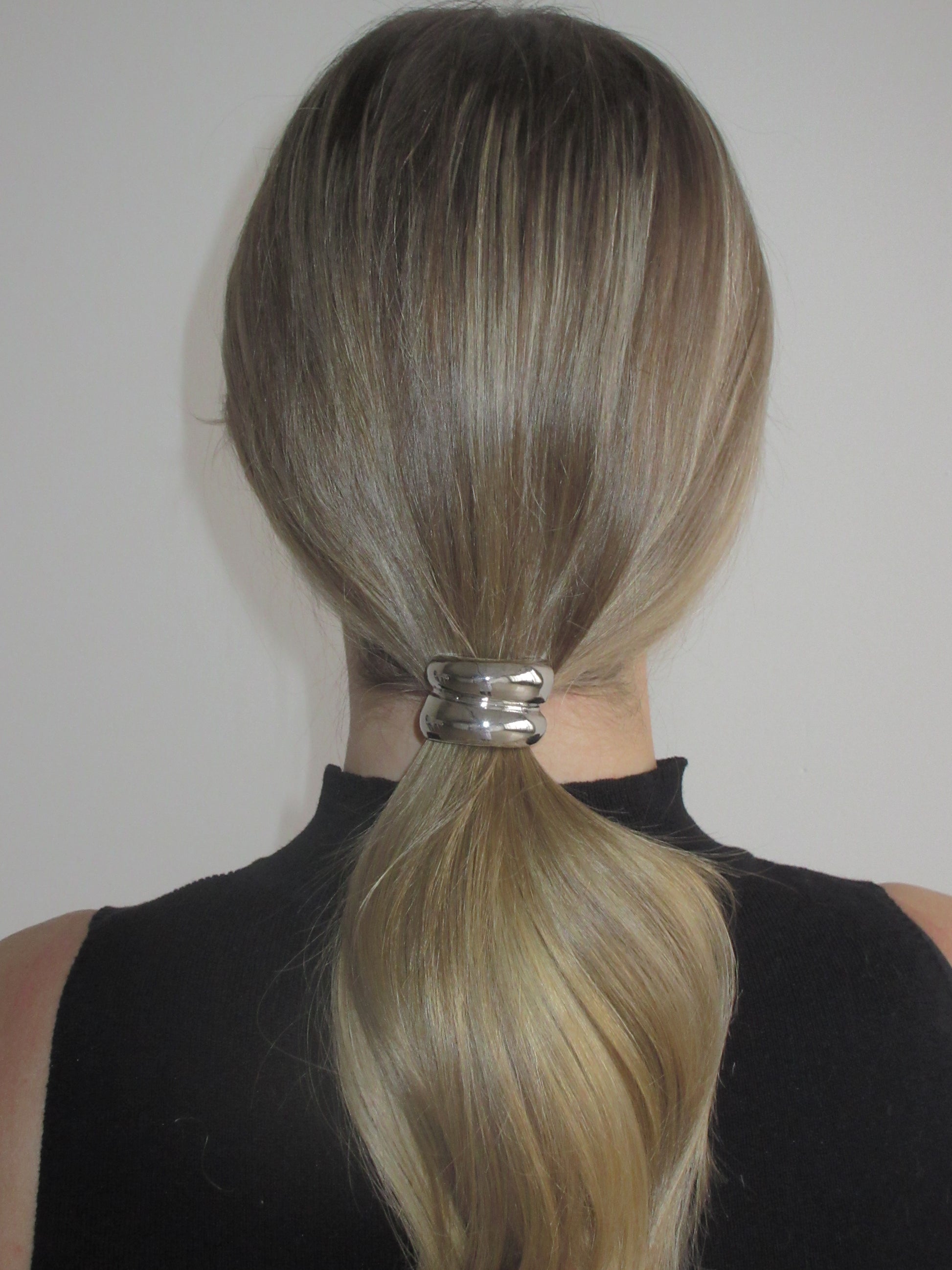 The Mini Double Arch Hair Tie features a sleek and minimal double cuff design - wear as a hair tie or wrist accessory to elevate any outfit.